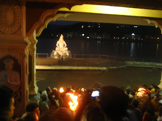 The Ganga Aarti at Parmarth Niketan ashram is organized and performed by ashram residents, particularly the children who are studying the Vedas there. The ceremony commences with the singing of bhajans (devotional songs), prayers, and a hawan (a purifying and sacred ritual that takes place around a fire, with the offerings made to Agni, the fire god). The lamps are lit and the aarti occurs as the final part of the ceremony. The children sing along with the spiritual head of the ashram, in sweet, haunting voices. A huge statue of Lord Shiva overlooks the proceedings.